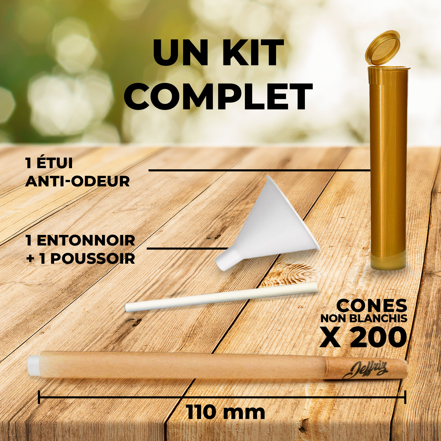 Chaque boîte contient 200 cônes de haute qualité en papier naturel non blanchi, offrant une saveur pure et une combustion lente et régulière. La gomme naturelle est appliquée en quantité minimale afin de préserver au maximum le goût.